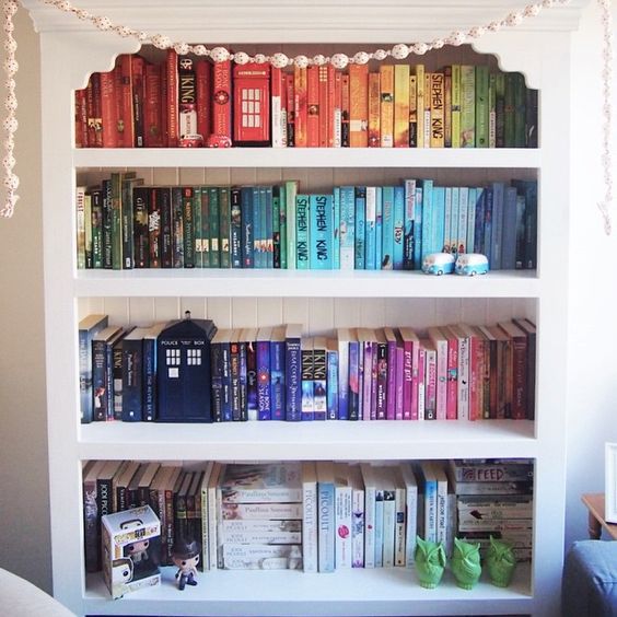 Wie ihr seht gibt es viele viele Möglichkeiten um sein Bücherregal zu sortieren. Falls ihr euch für den Regenbogen was auch gern #rainbowbookshelf oder #rainbowshelf genannt wird entscheidet wäre das klassische Farbschema Weiß – Gelb – Orange – Rot – Pink – Lila – Blau – Grün – Braun – Grau – Schwarz. Aber mit welcher Farbe ihr letztens endlich anfangt ist ganz euch überlassen. 😉